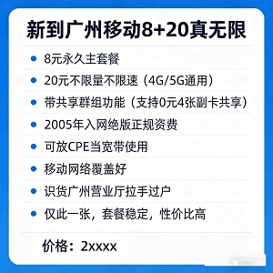 绝版封神!广州移动8+20真无限,2005年入网稀缺资费太香了在流量告急、套餐溢价严重的当下,一款真正的“良心资费”有多难得?今天给广州的小伙伴们挖到宝——广州